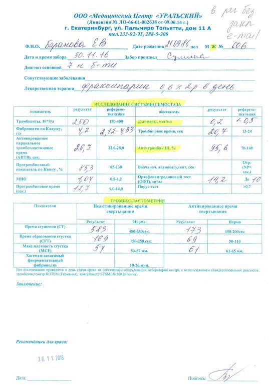Позвонил гематолог из больницы, отругал за такую дозировку фраксипарина, сказал оставить 0,6 и через 2 недели контроль