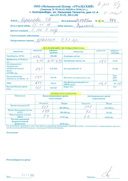 Съездите в лабораторию Суханова. Он хороший гемостазиолог. Сдайте у них анализы, через 1-1,5 Вас примет доктор и назначит лечение.