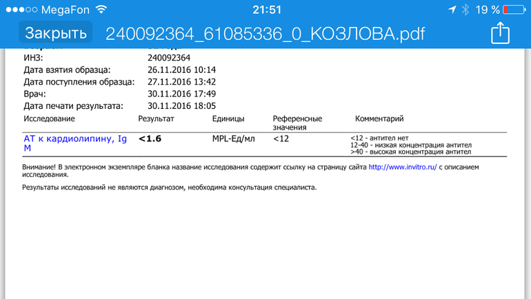 А, ещё. Я так понимаю, в инвитро сдавали? У меня тоже в инвитро волч антикоагулянт отрицательный (там либо отриц, либо пол). А пересдалс в другой лабе (более современные исследования), а там у меня получился слабоположительный результат.