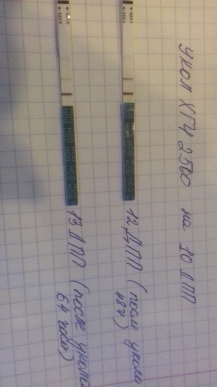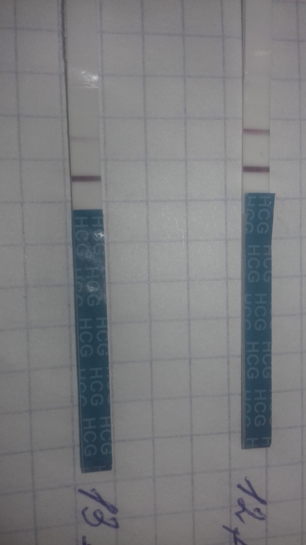 Дела такие, сегодня 13 дпп... В поддержке уколы ХГЧ 2500 на 0дпп, 5 дпп, 10дпп....тестики, естественно, начала мочить уже с 6 дня, полосатят, ничего не скажу, но помнимаю ж, укол!!!! Вообщем, сделала укол на 5дпп, перед тем как сделать на 10 дпп делаю тест ( тоесть прошло 130 часов от укола) - полоска есть, слабая конечно, но присматриваться не нужно. Вчера делаю тест (спустя 48 часов после укола) - яркая такая, жирненькая красотка (эх, всегда б так), сегодня (спустя 64 часа после укола) - тоже хорошая, но, уже не такая как вчера...ХГЧ кровь только послезавтра ( выходные лаба не работает, а платных нет)...Фото кидаю.