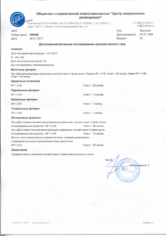 Была на консультации у РЕ, она посоветовала сделать доплерометрию сосудов матки (малого таза), вот вчера дождалась 20дц, сделала.