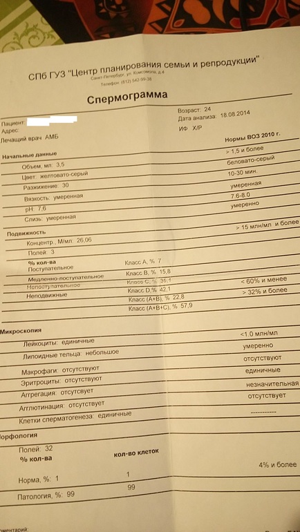 Спермограмму обязательно с морфологией по Крюгеру сдайте и от результатов уже будете думать ,у нас обычная спермограмма была идеальная ,а морфология оказалась -0% ,с такой спермограммой еб почти не возможна .