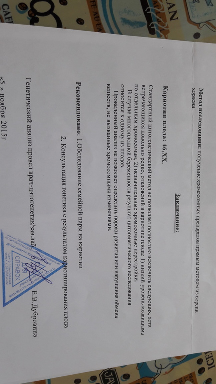 мы не были на конс . это она мне по телефону сказала. мы хотели по результату записаться к ней , по ahl и кариотипу. ну у нас мужем совместимость одна , и кариотип вот такой 46ХХ , 46YX, вот я ей позвонила говорю вот так пришли анализы . Она говорит я видела . я просто у них в лаборатории их сдала. у вас все хорошо. Вот и все. говорит звоните если возникнут вопросы.