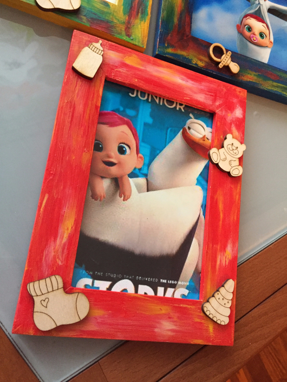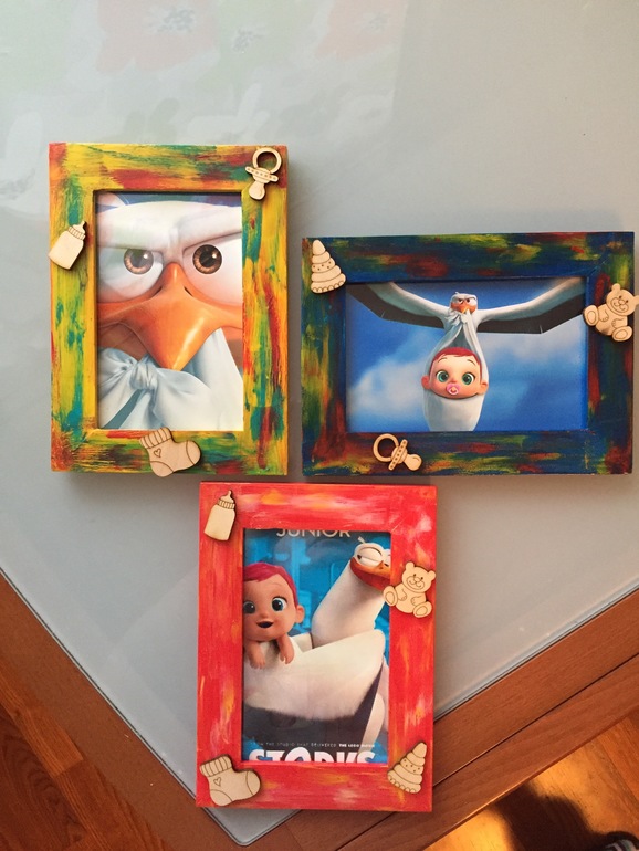3 рамки, которые я сама раскрасила, с фото аистов, которые я очень надеюсь вы скоро замените фотографиями детишек. Какая вам достанется, не скажу. Красная девочка, синяя мальчик, желтая оба)