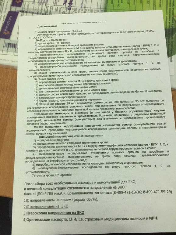 ЭКО по квоте и полису ОМСсегодня приехала к врачу, все анализы по списку сдала в декабре которые нужно для ЭКО. Отдала кучу денег. А врач говорит что теперь с 2017 года изменилось все и анализы нужны именно от 2017 и не важно что твои от декабря. Сдавай заново по списку!!! Это пипец. Неужели только у нас такой врач????и опять дала список целый все тоже самое. Мало того что с андрологом мурыжила говорила так теперь тут. Говорит минздрав разворачивает если анализы 2016, уж не знаю правда или нет. А как у вас? Интересует Москва.