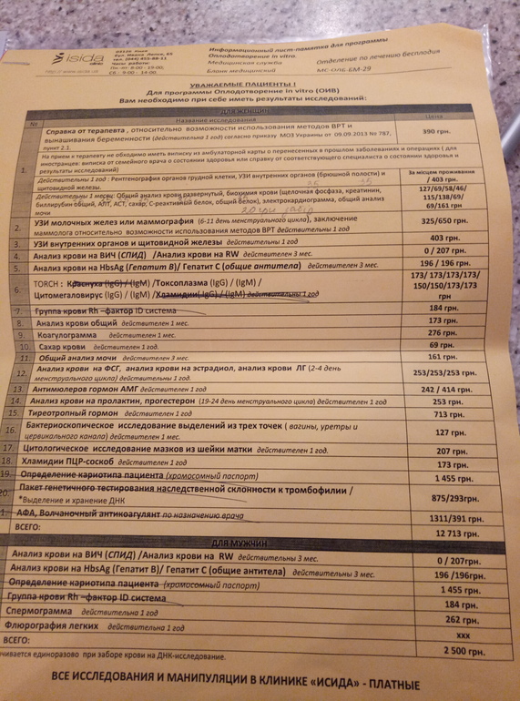 Подружку из Украины хочу записать на онлайн-консультацию (консультация с врачом в скайпе), которая бесплатная, но проводится с одним пациентом лишь единожды... Так вот хочу, чтобы их беседа была максимально продуктивной. Нужен список анализов для ЭКО, чтобы уж сразу быть подготовленными.