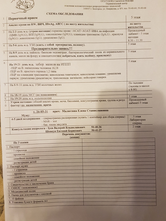 Брала список анализов на сайте клиники и по нему сдавала анализы в жк , кроме амг и мазков ПЦР. И на приём к репродуктологу со всеми анализами и ксерокопией документов( паспорт, страх. свидетельство, полис). Сразу написала заявление и через 2 месяца вступила в протокол.