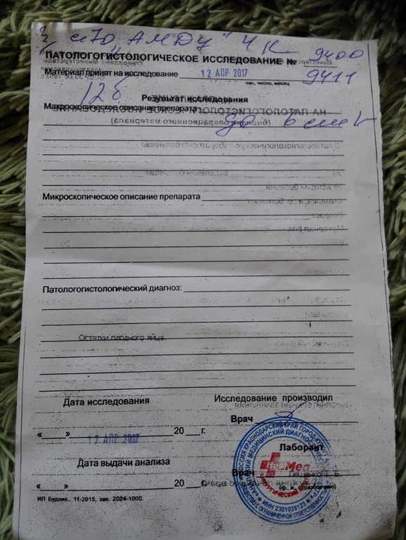 Вставлю свои пять копеек... В клиническом диагнозе написано патология эндометрия, в скобках непонятно, но это то, с чем биоматериал поступил на исследования. А вот на обороте как раз должно быть описание. А там кроме "остатки плодного яйца", ничего и нет.... Ольга, вам бы сходить к ним и уточнить настойчиво, где гистологическое заключение.