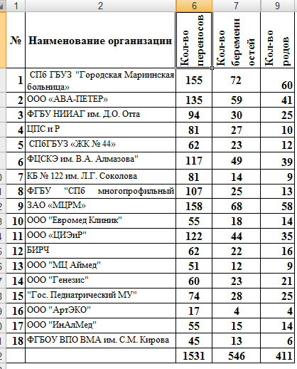 и там есть ИТОГО- Переносы-2434, Беременности-885, роды-386