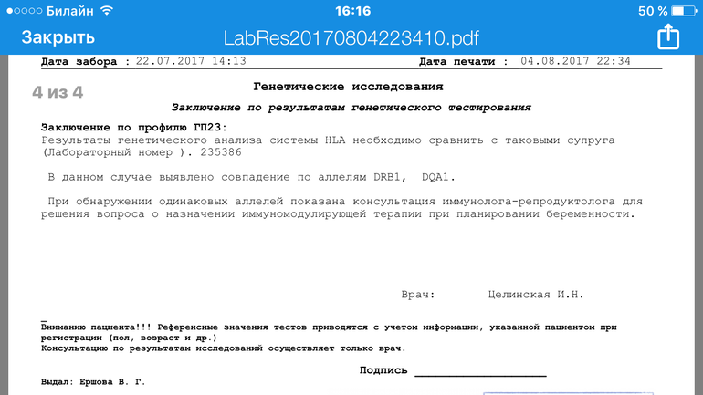 Последний анализ на фото ваша или мужа? У одного из вас гомозогитность. Вам пересылаю ответ моего врача по поводу гомозиготности...." гомозиготность одоготиз партнеров, чаще женщины в любом случае является отягощающим фактором - это уже сбой иммунных реакций. Далее, изолированно dqa1*501 никакой нагрузки не несет, отягощающим считается носительство гаплотипа 11/501/301 - носители его имеют более агрессивный иммунный ответ, актуальнее для женщин. У мужчин носительство аллеля dqa1*201 оуславливает развитие анэбрионий в 50% случаев."