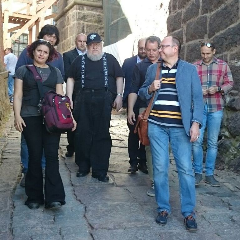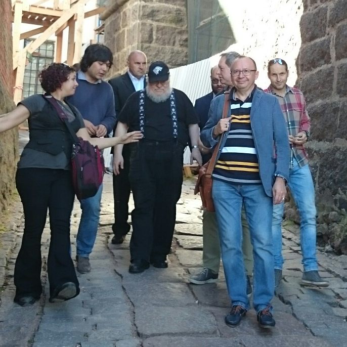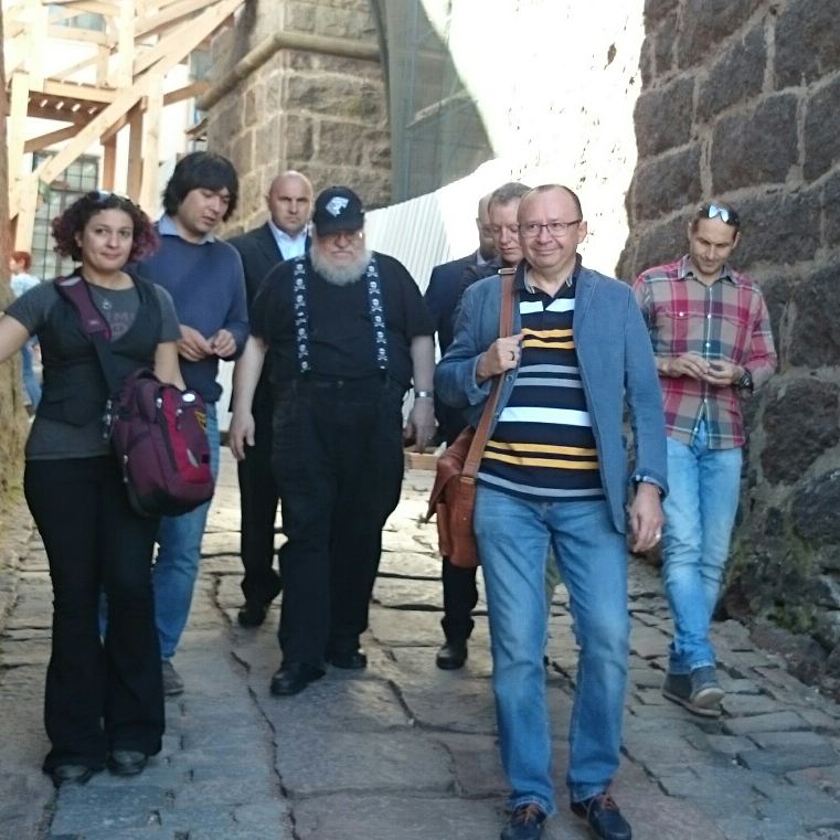 Однако, день запомнился не этим. В Выборгском замке есть музей, типа историко-краеведческого, там три этажа. Посадила я одну дочь к себе на шею, спускаюсь с третьего этажа вниз, а навстречу мне поднимается какой-то очень знакомый толстый старик... "Это что, Джордж Мартин или меня глючит?" думаю я вслух и пропускаю небольшую делегацию, сопровождаемую двумя внушительными секьюрити. Один секьюрити утвердительно мне кивнул... Я выхожу из музея и брат мужа начинает мне рассказывать, что только что столкнулся в музее с дедом, поразительно похожим на Джорджа Мартина. "Это и был Мартин", говорю я и вся наша семейка принимает решение, что детям надо перекусить)))) Пока дети доедали второе мороженое и еще кучу всего, Мартин музей досмотрел))) Я как раз вспомнила, что в Буквоеде анонсировали его приезд в Питер (автограф-сессия?) и статью о том, что Мартин готов черпать вдохновения для цикла книг из русской истории))) Вот так встреча, кто бы мог подумать, что я, человек из Подмосковья, встречу американского писателя в выборгском замке... Чудеса)))) Мартин, конечно, не Святой и кумиром для меня не является, хоть я и люблю его книги, но поглазеть, согласитесь, чудно)))