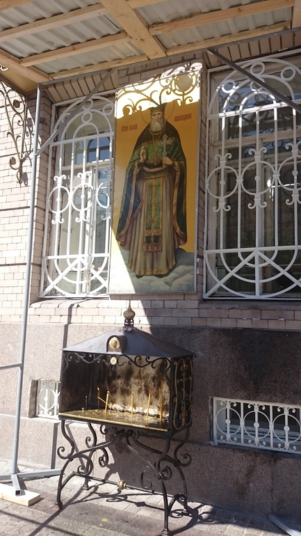 На стене рядом со входом установлен навес, под ним икона Святого и подсвечник. На стене вмятина от креста.