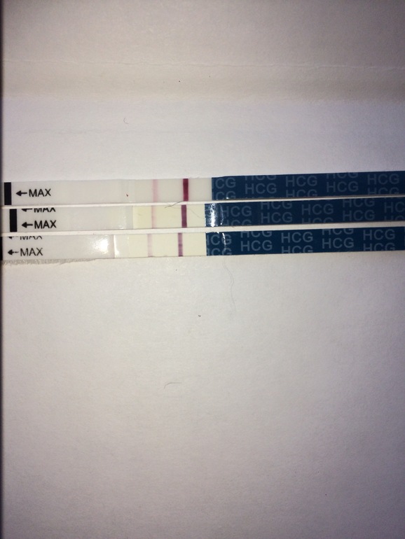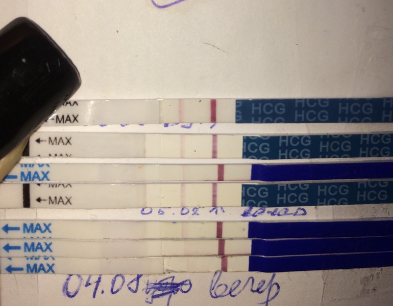 Убрала все лишние тесты,оставила только эвик. Нижний-вторник, средний спела, верхний сегодня. Все делала вечером. Верхний ещё мокрый.. полоска появилась сек через 5, потом начала проявляться. Завтра иду на хгч в любом случае,а там будет видно. По мне-динамики нет. Потом может скину когда высохнут все..