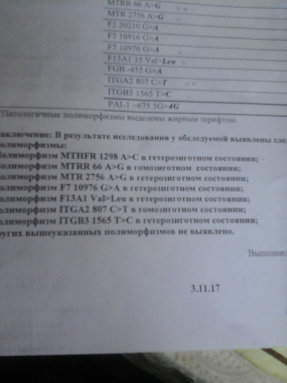 Привет! f13a, itga2, pai - отвечают за свертываемостт крови, причем первый- за предрасположенность к снижению свертываемости крови, а второй и третий- за риск тромбозов. они у тебя в гетерозиготной форме- это не айс, но все же лучше чем в гомозиготной форме. че делать- мониторить коагулограмму ( обратить особое внимание на д димер) до беременности, и впротоколе. у меня кстати именно эти же мутации один в один такие же.