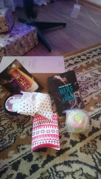Я была очень рада. Скорее схватила телефон чтобы фотографировать, позвала свекровь посмотреть и пошла к елке распаковывать подарок. В коробке стоял такой аромат. это были шарики для ванны, так же там были маски для лица что в преддверии нового года так важно, скрап для тела и коробка еще одна и маленький рыжий конвертик. этого я сначала не раскрыла. а выложила все чтобы сфотографировать.
