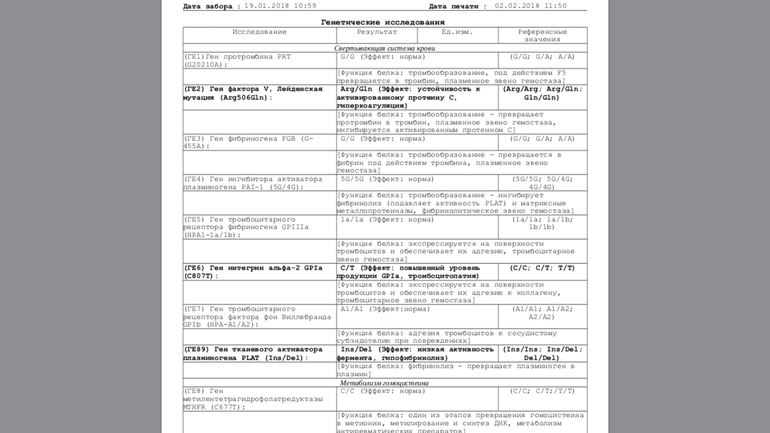 У вас как я поняла по картинке Лейден = диагноз тромбофилия, стоит искать хорошего гематолога. Ну и кучка др мутаций..