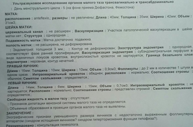 Гормоны (АМГ,Прогестерон,Эстрадиол,ФСГ и т.д)Сегодня была на узи, по результатам яичники очень уменьшились и всего 1 фолликул виден! В прошлом цикле в каждом яичнике по 3-4 было... Врач сказала, что это может быть из-за приема Фемостона и в принципе неверной гормональной терапии...