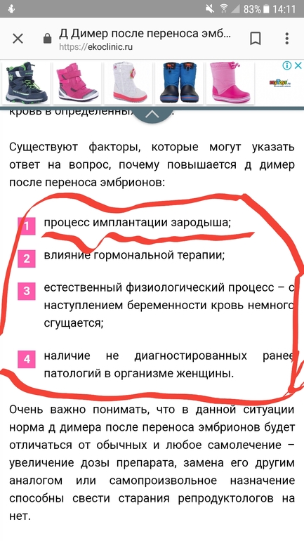 У меня на фоне стимуляции был высокий ддимер, ре об этом предупреждал. Остальная коагулограмма была в норме. Есть мутации гемостаза, поэтому гинеколог назначала до 16 недели колоть клексан и еженедельно мониторить ддимер. Сейчас пошла в крио в ЕЦ, после подсадки сдала ддимер на 8 дпп - пришел результат нормы (98).