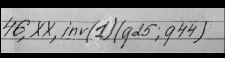 Кариотип женский, инверсия на первой хромосоме. Т.е. кусок хромосомы перевернут на 180°. Задействовано длинное "плечо" хромосомы, указаны номера участков, между которыми находится этот вывернутый кусок.