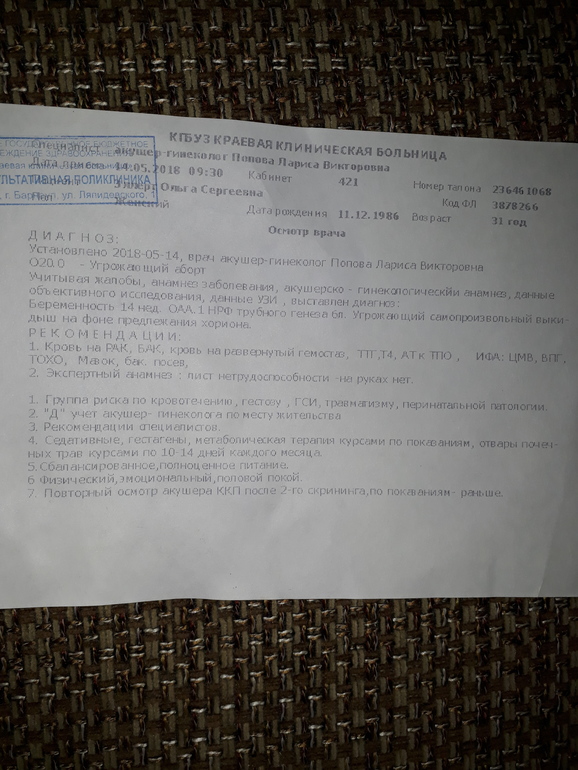Здравствуйте, была у врача, жалоб никаких не было, все хорошо. Почему в диагнозе написано угрожающий аборт, угрожающий самопроизвольный выкидыш??? Барнаул, фамилию врача видно, было очень много людей, все на нервах, одна медсестра на три кабинета. Меня несколько раз спросила - б желанная, планируемая??? , просто эко это естественно желанно и планируемо.