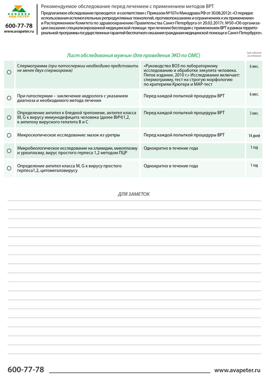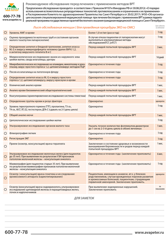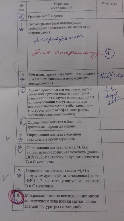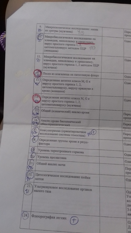 Список перенесенных операций (с копиями),госпетальный комплекс (вич сиф и гепатиты) общий анализ крови,клинический анализкрови,биохимия,группа крови резус,анализ мочи,гемостаз,гармоны(лг,фсг,экстрадиол,пролактин,кортизол,тестостерон,прогестерон,амг). Пцр на зпп(уриоплазма,хламидия,микоплазма,впч 16 и 18 типа). Кровь ИФА цмви,краснуха,токсоплазмоз,впг 1 и2. Мазок на флору,мазок на онкоцитологию,кольпоскопия,гистероскопия,гистология,узи мт,мж,щж +их же консультация(если проблемы),консультация терапевта,психиатора,нарколога. Флюшка,экг. Муж:Спермограмма+MAR-тест,вич сиф геп в с,анализ на зпп.