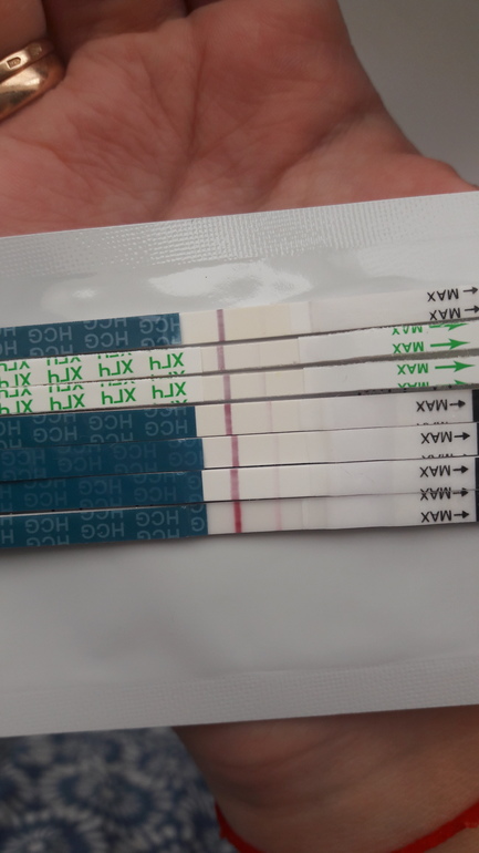 Мои тесты, тоже сверху вниз начиная с 5 дпп. Как видите, у меня тесты так и не стали прям яркими, хотя хгч на 11 дпп был уже 212. Так что, верьте в малышочка или малышочков до конца)) все будет хорошо))