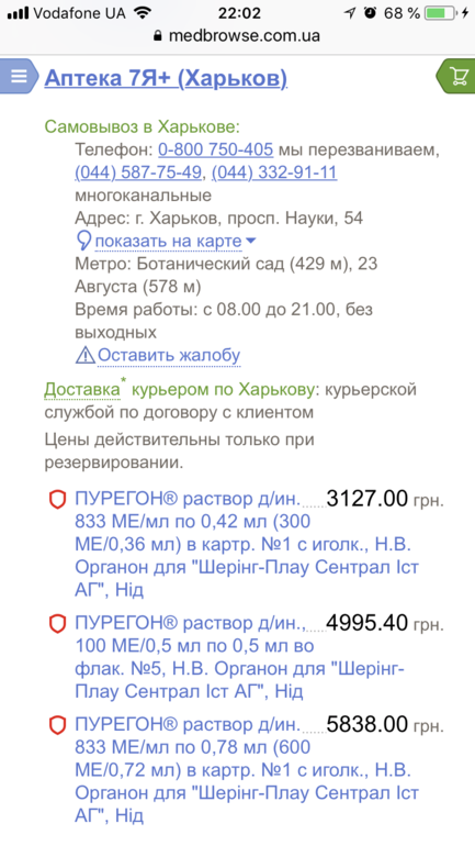 В эту аптеку я позвонила. Но и во многих других есть. Вот сайт наличия: https://medbrowse.com.ua/puregon-cena/kharkov