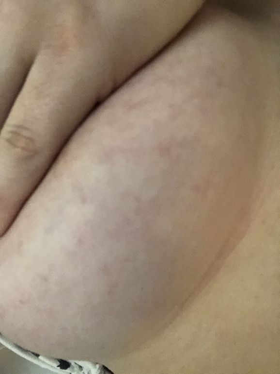 У меня похожая фигня, под грудью и на животе по бокам. Началось после кокосового масла. Тоже чесалось, даже как-будто какие-то мелкие болячки появились. Перестала им пользоваться, купила другое. На мой взгляд стало лучше. Попробуйте сменить масло или заменить на крем.