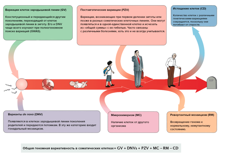 Мозаицизм - нередкое явление на стадии преимплантации. В этом случае любая мутация способна оказать значительное влияние на весь организм: определенный мозаичный генотип потенциально может в итоге оказаться во многих клетках..В первые дни эмбрионального развития, по некоторым оценкам, на каждое деление на одну клетку приходится три мутации с заменой нуклеотидных оснований. При этом клетки на этом этапе часто делятся асимметрично и, соответственно, вносят разный вклад в клеточный состав в более взрослом организме.