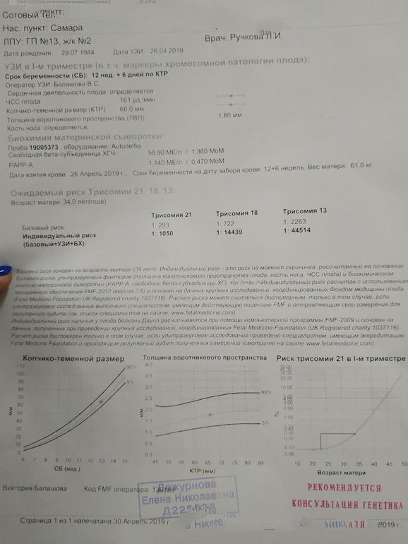 Девочки, у кого-нибудь было что-то подобное? Какой итог? По УЗИ у меня всё отлично, всё соответствует сроку. Сегодня была у генетика, ещё раз смотрели носик и воротничок, тоже все хорошо. Но кровь такая вот. Стоит переживать или жить спокойно? Кровь пересдать не сказали, а может всё-таки надо?Генетик написала: низкие риски. Ps. У меня была двойня, один замер в 9.3.