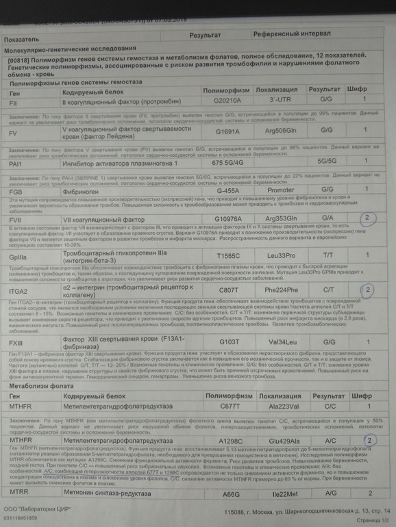 Сдавала анализ на мутации год назад. Мутации F7, ITGA2 и в фолатном цикле MTHFR.