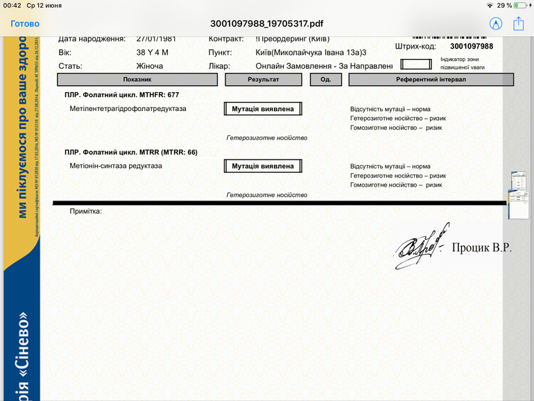 Девочки, кто уже в этой теме, поддержите, а то такое отчаяние наступило, просто выть хочется. Получила свои результаты, доктор мой будет с 18 только принимать-в отпуске. За плечами прерванная беременность (синдром Дауна) и выкидыш в 6 недель. Есть дочка от первого брака, 16 лет. Четыре неудачных ЭКО. Не знаю можно ли здесь давать ссылки, но вот что нашла. Прочитанное меня очень встревожило. Также прикреплю свои результаты. Подскажите, на эти мутации можно как-то влиять?