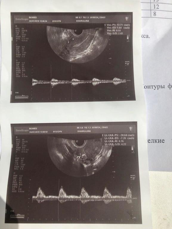 1.Правая маточная артерия 2.Левая маточная артерия 3.Аркуатные артерии 4.Радиальные артерии 5.Базальные артерии 6.Спиральные артерии Наиболее важные для имплантации и вынашивания на первоначальном этапе и наиболее часто страдающие от ХЭ артерии - это Базальные и Спиральные. Пока кровотока в них нет, или он снижен, беременность может продолжать срываться/замирать. Правая и левая маточные артерии не столь важны для вынашивания на первоначальном этапе. Однако обычно с ними как раз у большинства все в порядке. Во время измерения сосудов, на экране монитора будут ловить пульсацию в каждой артерии, и вы будете видеть примерно такую картинку: УЗИст же будет замерять эту пульсацию. Это правильное исследование. Часто доплером называют еще вот этот "режим цветных пятен": Это тоже кровотоки в режиме доплера. Многие УЗИсты просто смотрят именно этот режим доплера и сообщают вам, что все хорошо. Не ведитесь! Информации о скорости кровотоков такое исследование не несет. Когда делать доплер? Доплер сосудов матки необходимо делать на 5-7 ДПО (день после овуляции). Нормы доплера есть на любой день цикла, и в принципе узнать о плохом кровотоке вы можете, сходив на доплер в любой ДЦ. На 5-7 ДПО его смотрят за тем, что это время приходится на окно имплантации при возможной беременности. Какой нужно получить результат от УЗИста на руки? Правильный результат доплера выглядит как все перечисленные выше артерии с количественными показателями, включая самый популярный - Индекс Резистентности (ИР). (Или только с ИР, этого достаточно). Если по-английски, то RI. Данный индекс характеризует скорость кровотока и имеет свои нормы. Резистентность - это сопротивление, то есть чем ИР ниже, тем лучше, тем быстрее кровоток, а значит лучше для беременности. То есть когда говорят о высокорезистентном кровотоке, имеют ввиду, что кровоток плохой. Соответственно, на руки вам должны выдать результат ИР во всех шести артериях матки и вывод УЗИста о состоянии кровотока. Каковы нормы доплера? Нормы ИР для второй фазы цикла: