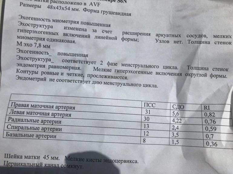 (Взято из научного труда) Некий профессор М.Н. Буланов разместил в интернете вот такие нормы на основании собственных данных. (Смотрим строку 19-23). У него нет норм базальных, спиральные такие же, для остальных артерий более строгие верхние границы: Большинство доплеров, что я видела, опираются на нормы, совпадающие с этой таблицей. Нормы по клиникам могут отличаться. Но незначительно (на сотые доли). В любом случае УЗИст должен вам написать, где у вас норма, а где нет. Как интерпретировать результаты доплера? Если значение ИР по любой артерии у вас НИЖЕ нормы, то это даже хорошо! Если значение ИР по любой артерии ВЫШЕ нормы, либо указано, что в какой-то артерии "кровоток не регистрируется", то такой доплер плохой: кровоток снижен и требуется его "разгон" физиотерапией. Если УЗИст не замерил вам все шесть артерий, такой доплер нельзя считать "хорошим", так как полной картины кровотока нет и вы не знаете, что у вас с кровотоком на самом деле. Если УЗИст вообще не замерял артерии, а просто сказал, что все хорошо. То тут тоже стоит засомневаться, замерил ли он он что-то вообще. Все другие артерии типа "интраоваривальной" или кровоток около желтого тела, не имеют значения в плане влияния на поверхность матки. Если доплер хороший? Если доплер хороший, значит ХЭ вынашиванию не помешает (при условии устранения остальных сопутствующих ему факторов). Подробнее тут. Что делать, если доплер плохой? Разгонять кровоток физиотерапией до получения хороших результатов доплера. Иногда требуется не один курс. Подробнее о физиотерапии тут. Но может быть есть исключения, когда не надо делать физио при плохом доплере? Исключение только одно - если Б наступает, но закачивается все время ЗБ, то есть имплантация все же происходит, то теоретически можно вытянуть на капельницах Актовегина с ХГЧ 1000. Однако это рискованно, и так как кровоток плохой, то возможно продолжение неудач.