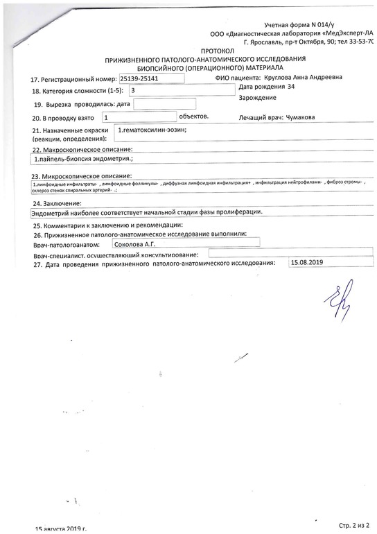 А в заключении: эндометрий соответствует начальной стадии фазы пролиферации.