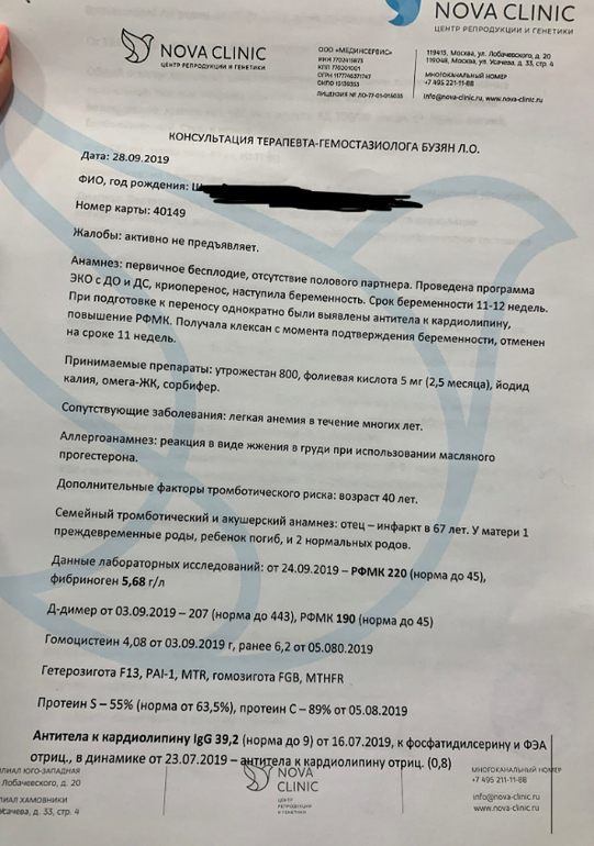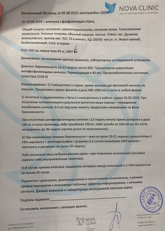 Была у Бузян Л.О. Оказалась моложе, чем я представляла. Приём доброжелательный, внимательный, на вопросы ответила, Контакты оставила для продолжения лечения в заочном режиме. По приему: сказала, что гемостазиограмму и рфмк больше не сдавать, все отклонения в беременность могут быть в любую сторону и не влияют на вынашивание. Так как у меня антитела к фосфолипидам были сданы или суммарно, или частично, сказала сдать антитела конкретно к каждому виду фосфолипидов. Если хоть один титр будет положительный, только тогда колоть Клексан 0,4. Следующая сдача антител 20-21 неделя для коррекции лечения. По поводу анти-ха активности гепаринов: поскольку мой вес 45 кг и дозировка 0,4, то даже если активность будет снижена, она не будет повышать дозу, чтобы не было последствий. Далее, по таблице риска тромбозов и преэклампсии у меня 2 фактора: первая беременность и старше 35 лет. Поэтому рекомендация для профилактики преэклампсии 150 мг аспирина разово в сутки на ночь с 12 недели до 36. Следующий приём (в заочном режиме) после второго скрининга с результатами антител АФС, д-дискриминанта и узи + допплером.