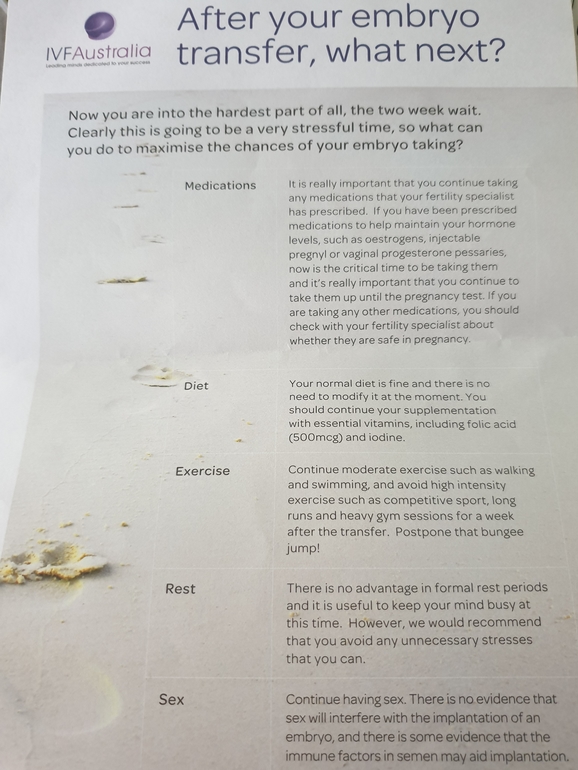 Образ жизни после переноса спокойный, но лежу немного. Придерживаюсь рекомендаций врачей (ниже - фото рекомендаций австралийских врачей (просто для сравнения с рекомендациями наших врачей) и мой перевод). Интересно, кто какого образа жизни придерживается после переноса? Что вам врачи рекомендуют? Какие ощущения и образ жизни были в удачном криопротоколе?