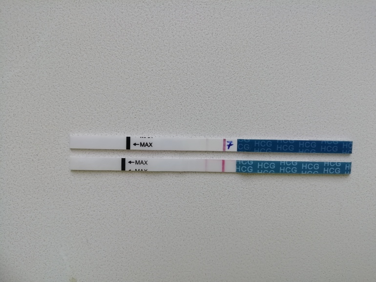 Вот 2 эви - теста с разницей в пару часов. Они ОДНОЙ фирмы... сделаны в один день, первый - на утреннюю мочу. И это при ХГЧ за сотню.
