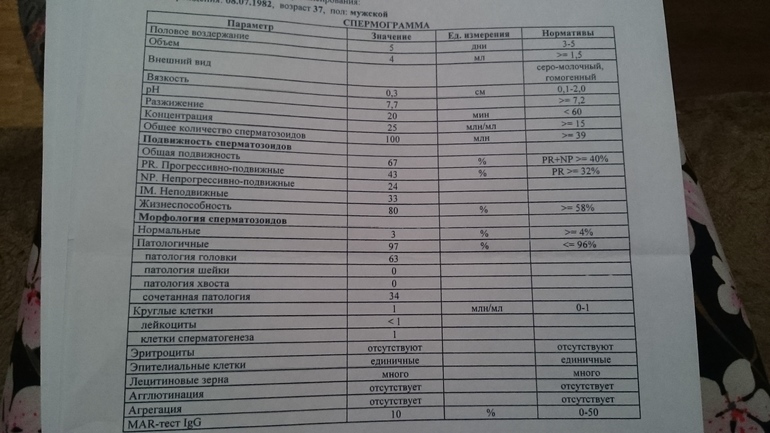 В протоколе полный облом. Шли по МФ (астенотератозооспермия), у меня все о'k. Исходно ожидали 15-20 фолликулов, стимуляция гоналом 125, фолликулы росли неравномерно и всего 7 фолликулов/ооцитов (АМГ около 7, фолликулярный резерв шикарный), все зрелые; со слов РЕ, мои яичники способны на большее. Оплодотворились 4, два эмбриона остановились в развитии на 2 д., на 5 д. были 2 морулы "не лучшего качества" (слова РЕ), их и перенесли. Естественно пролет. РЕ сказала проблема не во мне, тяжелый мужской фактор, предложила в след. раз сперму мужа со спермой донора 50/50. Мы естественно этого не хотим. Ведь бывает и более тяжелый МФ. Муж лечился, но морфология колеблется 1-3%.