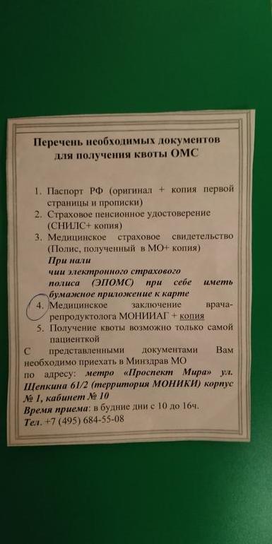 ЭКО по квоте и полису ОМСВсем добрый вечер. Нужна консультация по получению квоты в МО. Сегодня получила заключение для получения направления на процедуры ВРТ за счет средств ОМС по Моковской обл. Сказали ехать на комиссию в МЗ МО по ул. Щепкина д. 61/2,3 корпус, каб 111, но предварительно позвонить, номер телефона не дали, посоветовали найти в интернете. В интернете что-то не могу найти. Может у кого то есть, напишите пожалуйста. Квоту по Московской области получаю впервые, до этого получала в др. регионе у нас там всё по другому. Расскажите как происходит это вся процедура далее. Нужно с собой брать результаты анализов, заключения врачей. Врач сказала, что не должно понадобиться, но на всякий случай взять. Как они работают?