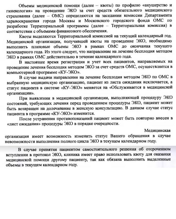 ЭКО по квоте и полису ОМСИтак, девочки, больше месяца назад я написала официальный запрос в Департамент Здравоохранения города Москвы по поводу срока действия квоты на эко по омс. И сегодня, наконец, получила ответ на целых двух! листах. В основном переливание из пустого в порожнее и бюрократические словоблудия. Но из всего этого я сделала только один вывод, официального документа, сократившего срок действия квоты с года до 3 месяцев, нет!Однако никто не помешает клинике изменить ваш статус в системе с "Обслуживается в клинике" на что-то другое. Прикладываю выжимки из него: