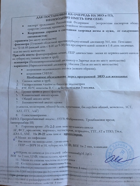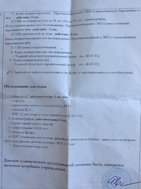 пожалуйста) и дополнительно поделюсь: я не знаю процедуру ЭКО ПО ОМС, так как пошла делать платно. Просто имейте в виду, что все анализы на ЭКО имеют свой срок действия. Допустим флюшка - 1 год, некоторые гормоны 6 месяцев, а есть и сроком 1 месяц. Поэтому начните собирать те которые хотя бы сроком 1 год и 6 месяцев, чтобы потом не было обидно, что какие-то анализы закончили свой срок и надо по-новой сдавать) я вот сейчас к переносу снова сдавала анализы сроком 3 и 1 месяц. Причем 3 месяца прям вот вот истекли. Вот это мне кажется самое геморойное в бумажной волоките.