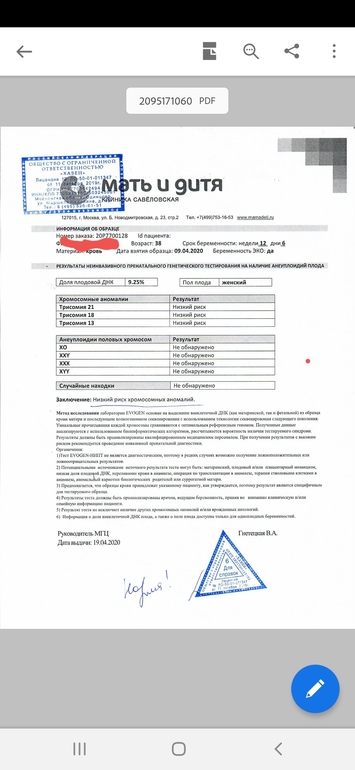 Анализы и процедуры. Помощь в расшифровке результатовДевочки всем привет! Нам уже 14 недель, растем) . В прошлом посте писала про первый скрининг, риск по крови 1:6, по узи все хорошо. Сдала неинвазивный тест, в ожидании старалась меньше думать, но переодически руки тянулись к интернету. Сегодня на почту пришел результат теста, когда увидела, думала сердце от волнения выпрыгнит и руки затряслись(.