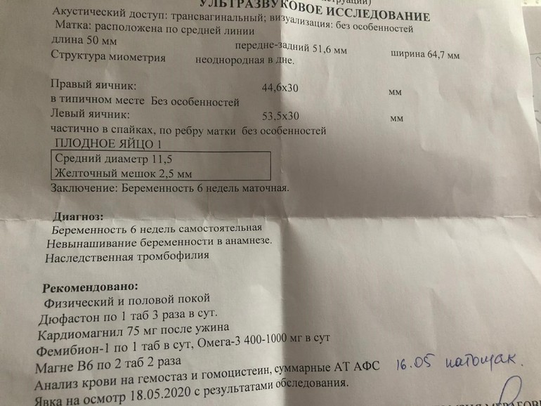 Плодное яйцо есть. Размер 11,5 Желточный мешок 2,5 мм. Репродуктолог сказала, что всё не плохо ,размеры чуть меньше, чем положены быть, но так часто бывает, поэтому нужно приехать на повторное УЗИ 18 мая.