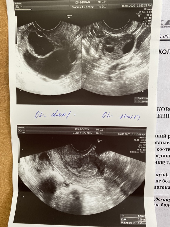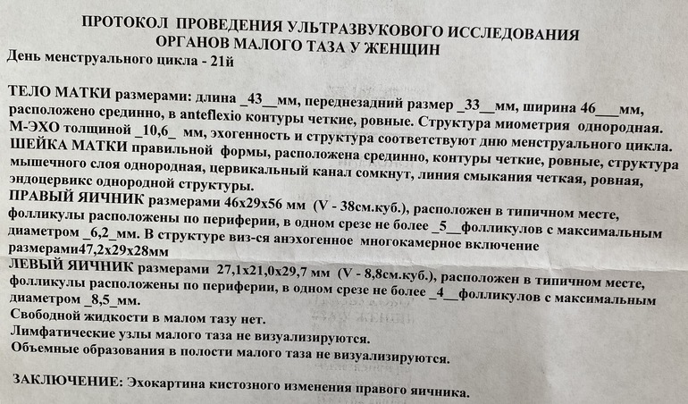 И вот сейчас 27дц. Пыталась тестами ловить О, но без результатов. Решила что её не было( у меня она вообще редкое явление). Так вот на 21дц решила сходить на узи, посмотреть что да как там. Обнаружили кистозное образование в правом яичнике. Но так как я по узи не следила, то узили не смогла сказать овуляция это была или это вообще с прошлого цикла осталось. А мне на 4-6дц ехать к Ре, крио по программе. Так вот скинула своей РЕ результаты. Говорит могла быть О и к двум таблеткам дюфастона (я пью его всегда с 16-25дц) сказала добавить ещё одну и на 28-29дц сдать кровь на хгч. Тесты не делала, я особо надежд не питаю, но так страшно опять разочаровываться. Сил с каждым разом все меньше. За плечами 9 лет попыток. Сильно колит периодически справа, все таки я склоняюсь, что это просто киста(( Прилагаю фото узи. Может у кого было подобное и в итоге вышло чудом?))