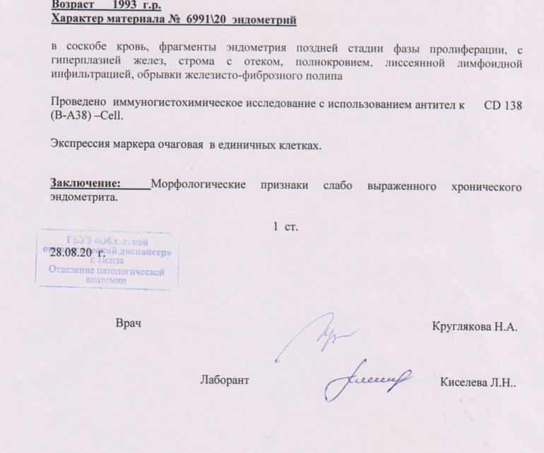 Результаты прикрепляю, вроде как слабо выраженный нашли эндометрит да и полип фиброзно железистый был.
