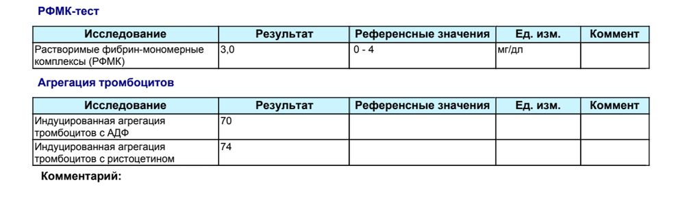 За день до переноса сдала коулограмму, РФМК и Агрегацию тромбоцитов.