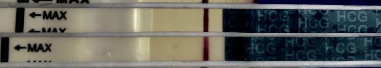Вот мои нижний вчера , верхний сегодня утром...там что то можно рассмотреть...но это похоже на реагент...полоска и на новом виднеется(((. Тесты мама чек.