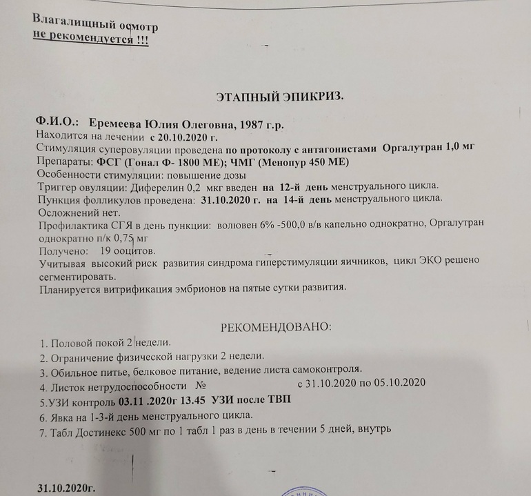 Протоколы ЭКО (Все о них, все об этом периоде+Гиперстимуляция)Сегодня пункция прошла успешно, чувствую себя хорошо. В этот раз ко мне отнеслись с особой заботой и вниманием. Низ конечно сейчас болит но этого и стоило ожидать, так как забрали аж 19 ооцитов. Сейчас есть надежда на то что оплодотворится хорошее количество, и не будет 2 эмбриона как в прошлый раз. Когда будет перенос я пока не знаю но мы уходим в крио из за гиперстимула. Интересует такой вопрос: когда у кого пришли М после пункции???Прилагаю свой выписной. Желаю всем удачных пункций и переносов.
