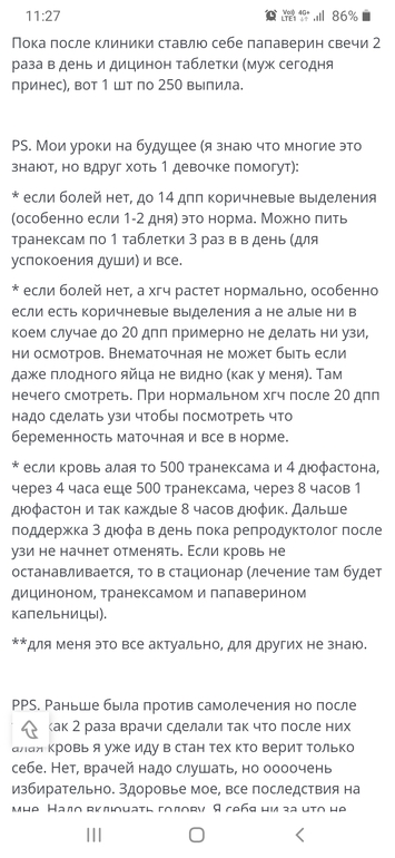 На 9дпп была алая, врачом было сказано сразу дицинон укол, от дня переноса мне его сказали носить с собой и не выходить из дома без него и выпила транексам 250, потом пила только транексам, ну и сопутствующие препараты как магний, папаверин и добавили укол прогестерона к моим 600 утрика и мониторинг хгч